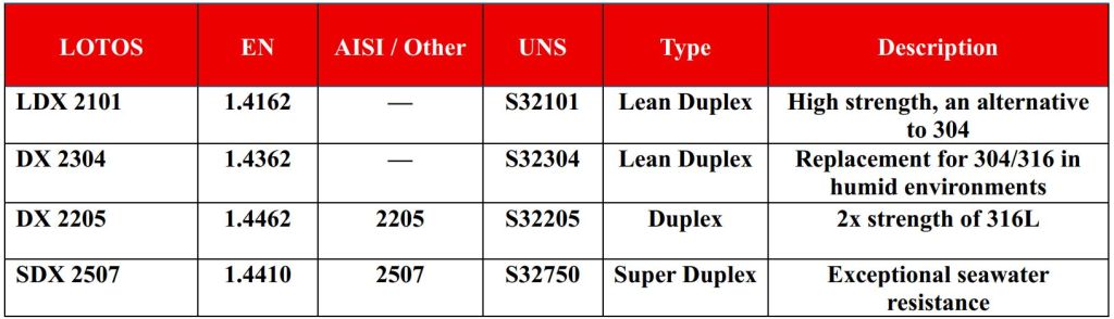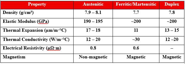 - Operating Temperature: Austenitic → excellent at low temperatures; Duplex → limited to ~250–325°C