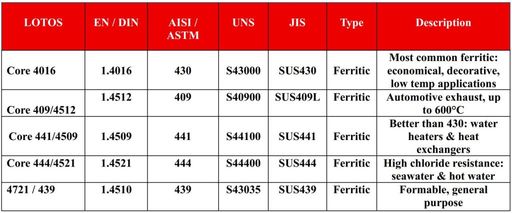 - EN 1.4509 / 1.4510 (Stabilized Ferritic)