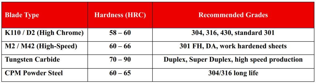 - Clearance (Blade Gap): Depends on thickness (0.01–0.12 mm range)
